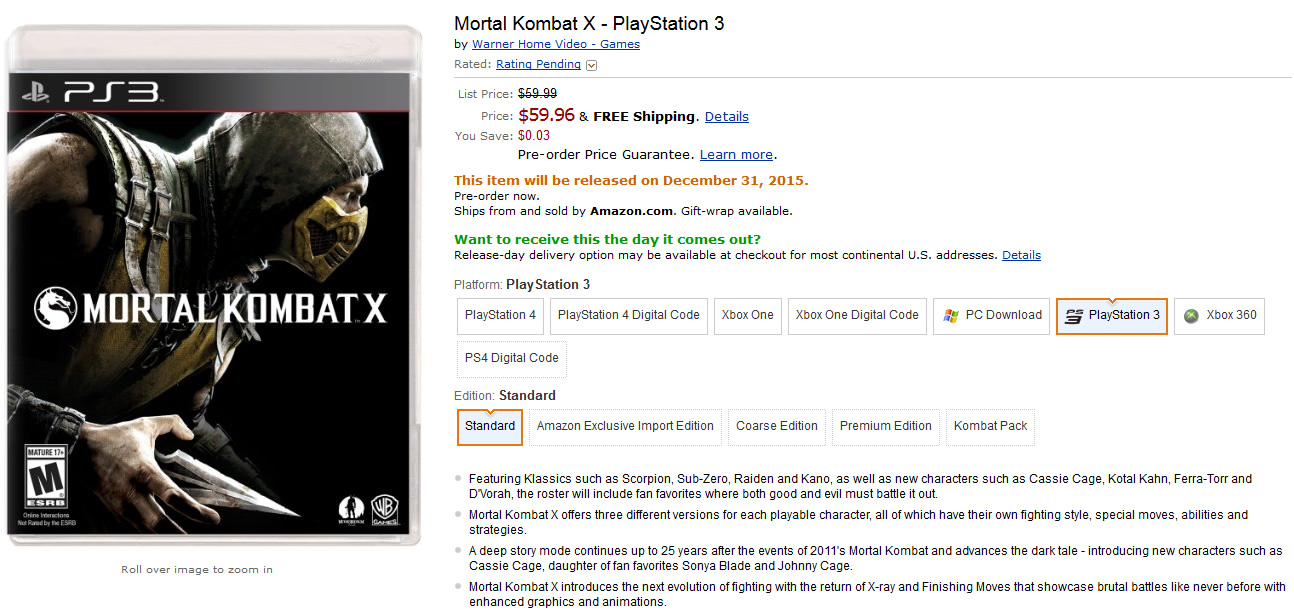 Las versiones de Mortal Kombat X para PS3 y Xbox 360 desarrolladas por High Voltage Software (responsable de la versión PC), podrían ver modificada su fecha de lanzamiento según varias tiendas especializadas, como Amazon y Gamestop, que indican que el juego puede lanzarse el 31 de Diciembre, frente al lanzamiento original previsto el 2 de Junio.