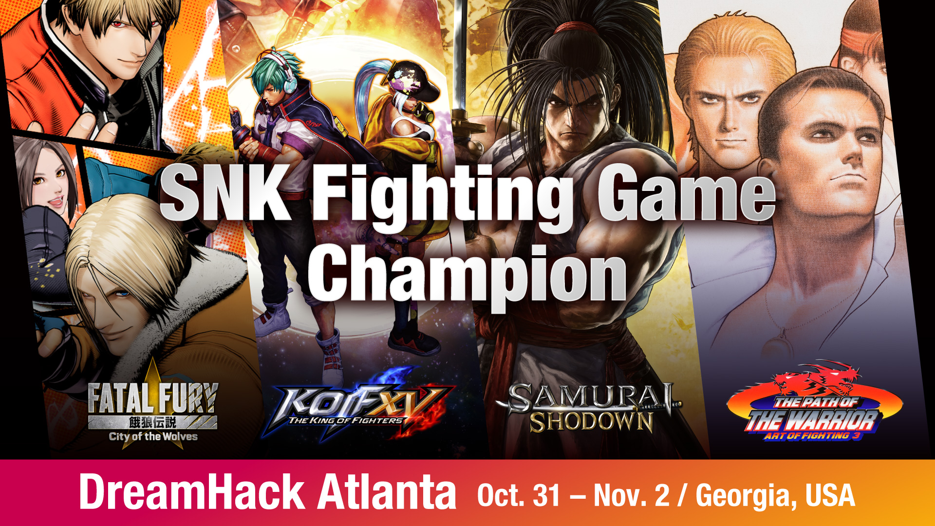 El SNK World Championship se llevará a cabo en Dreamhack Atlanta, en la Ciudad de Atlanta, Estados Unidos, y estará compuesto por los siguientes juegos de lucha de SNK: FATAL FURY: City of the Wolves, The King of Fighters XV, Samurai Shodown y Art of Fighting 3.